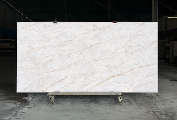 Sumptuous captures a layered interpretation of organic veining, combining a luminous white base with ribbons of warm gold and sandy beige. Soft golden accents create a cozy, inviting glow, elevating its natural elegance. The veins are pronounced and dynamic, forming flowing patterns that feel sculpted by nature. Subtle shadowing and tonal shifts add depth, giving the surface a dimensional, almost cloud-like texture beneath the veining. Sumptuous strikes a compelling balance between softness and visual intrigue, offering a refined statement that feels totally timeless.