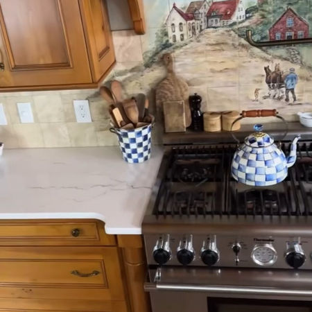 "It all started when my hubby gave me a hand written certificate at Christmas for a new island countertop. We wanted to see if we could be happy with just replacing the island. We wanted to keep our backsplash and we were afraid that removing the perimeter counters would damage the custom painted mural.